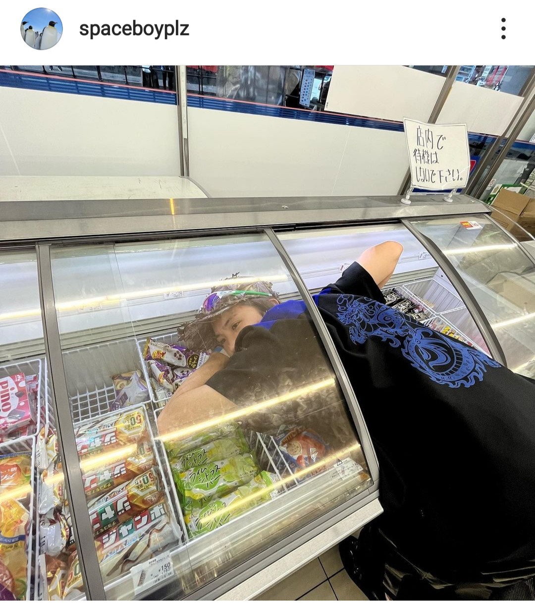 音楽グループ・STARKIDSのメンバーのSpace Boyが、コンビニのアイスケースにダイブする写真をインスタグラムにアップ。