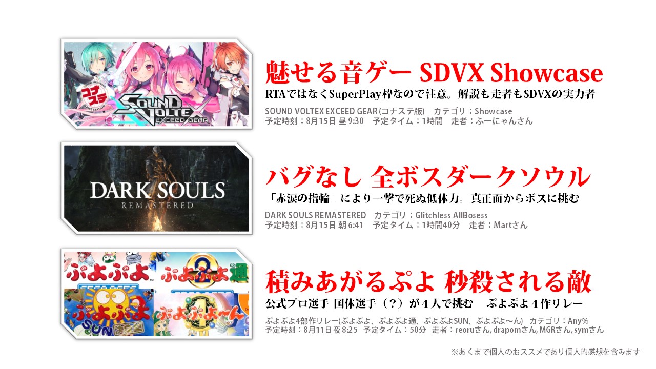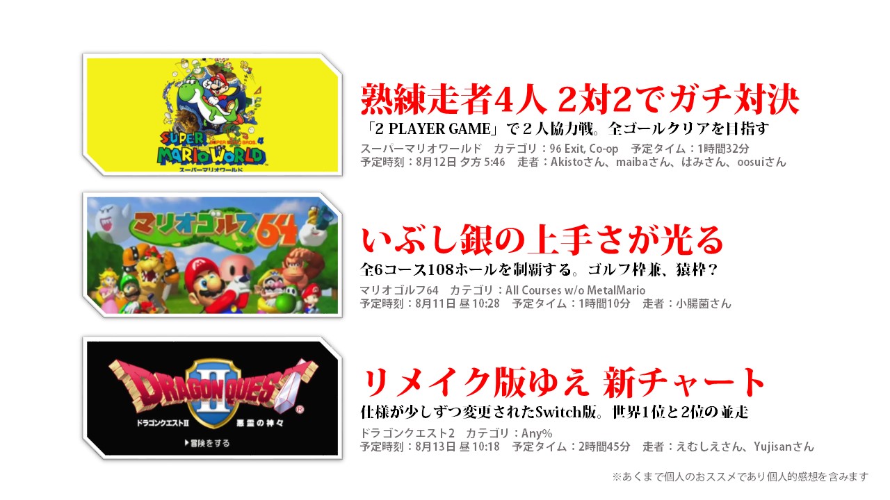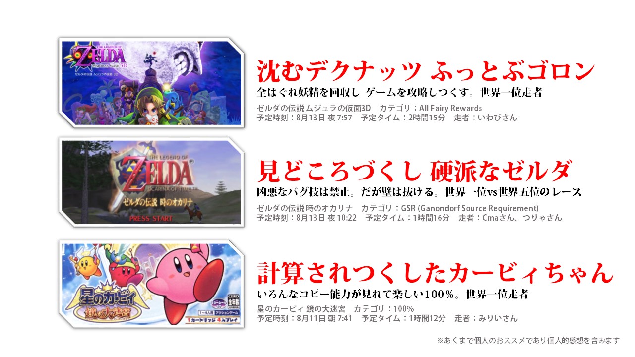 また、「ゼルダの伝説 ブレス オブ ザ ワイルド」や「ときめきメモリアル~forever with you~」については目隠しをした状態でのRTAに挑むなど、特殊な状況で挑戦するものも存在。ラストを飾るのは8月15日19時50分より開始予定の「スーパーマリオ64」となる。