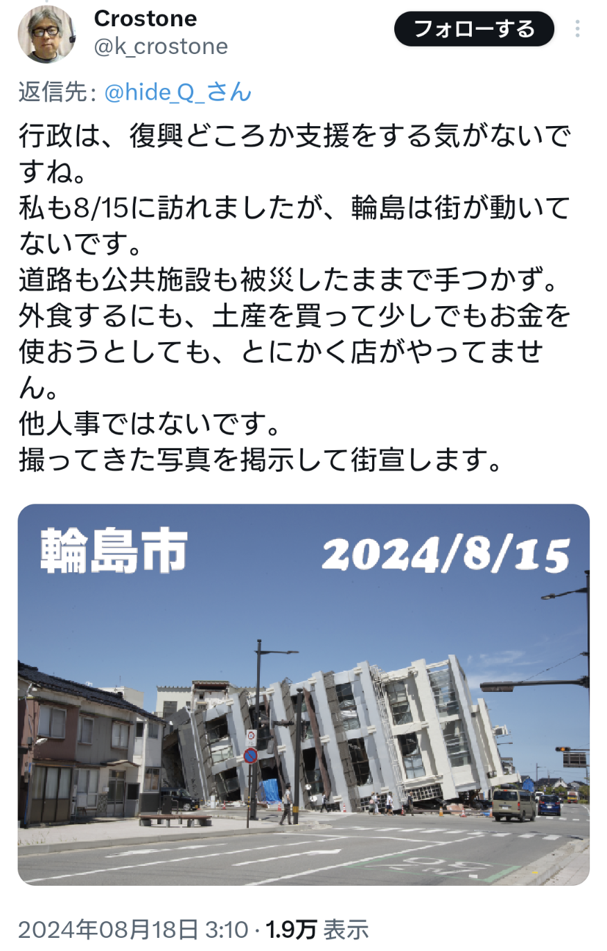 笑いながら写真撮って「行政は復興する気がないですね」とか「善良な納税者を敵にまわした」とかXにあげるってこと??