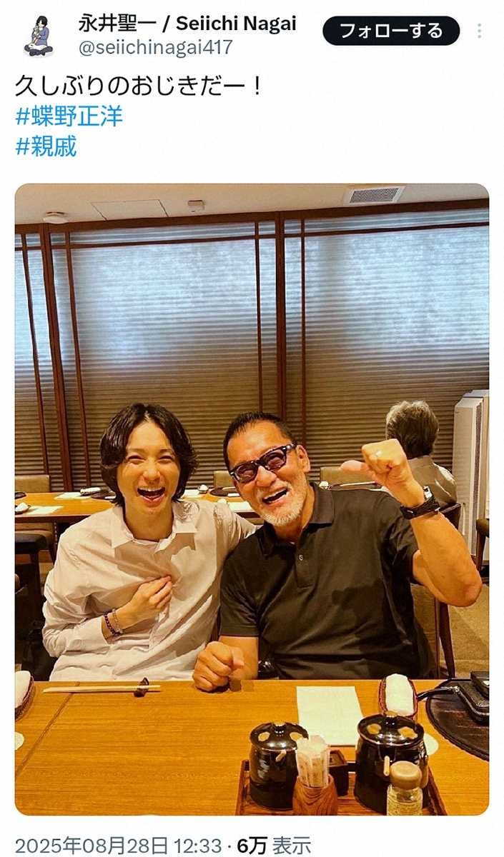 また、永井の妻でモデルの山口尚美も2ショットを投稿し「パパ側のご親戚に蝶野さんがいらっしゃる奇跡 とっても楽しくお喋りさせて頂きました ありがとうございました」とつづった。