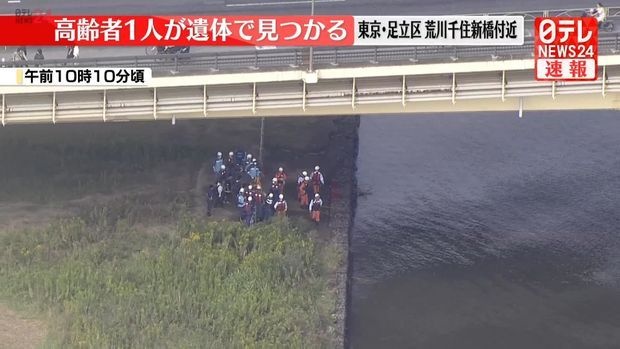 東京消防庁によりますと、12日午前10時前、東京・足立区を流れる荒川の千住新橋付近で「黒い服を着た子どもが流されている」と119番通報がありましたが、その後、この川で80代とみられる女性1人の遺体が見つかったと
