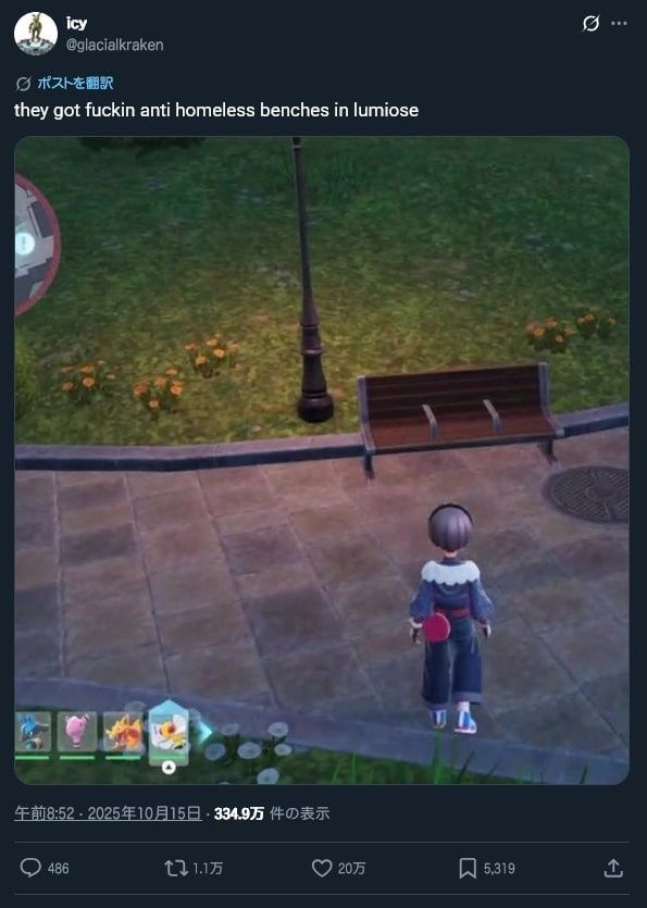 ポケモンの世界にもホームレスがいてこの自治体はアンチホームレスベンチを設置してるという設定なのか