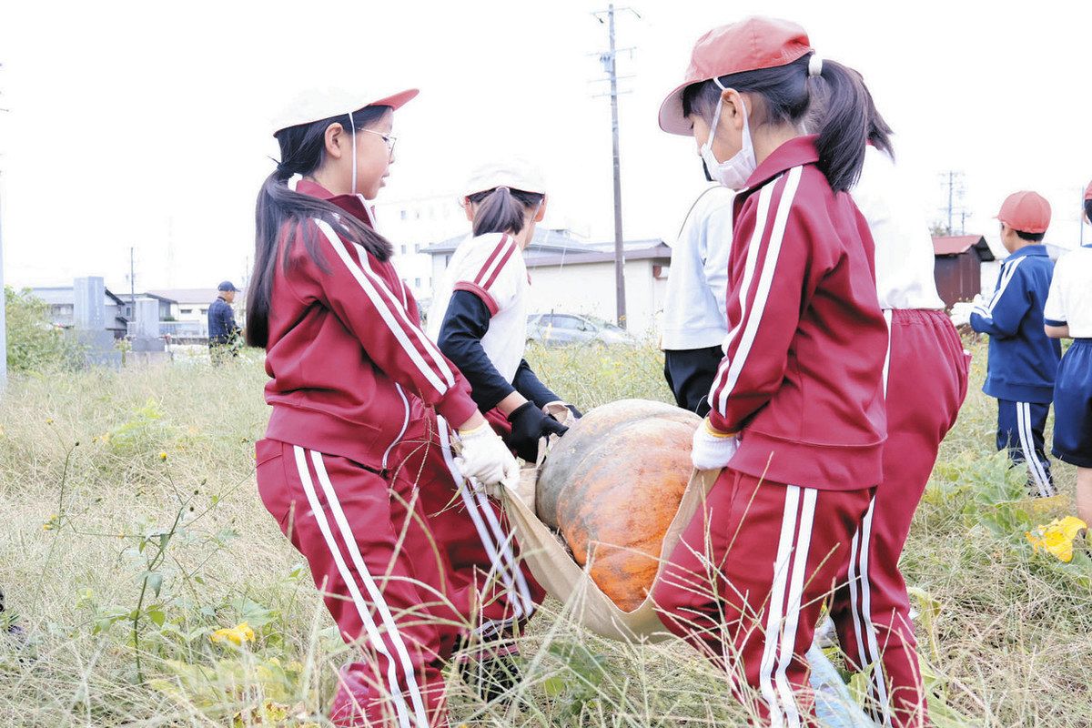 ハロウィーンに向けて安八町牧小学校の3、4年生が22日、同校北側の遊休農地でカボチャ約30個を収穫した。