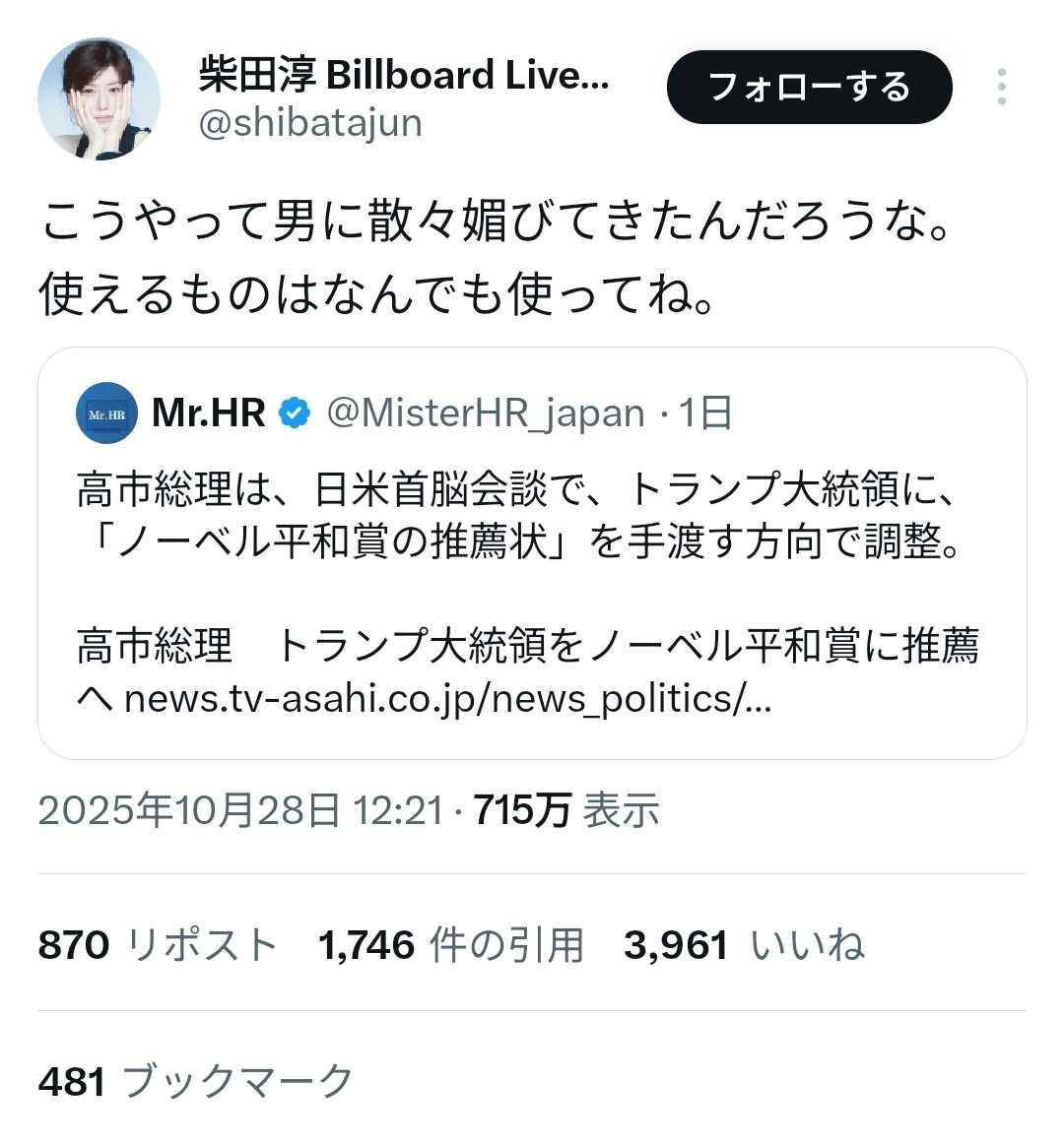 そんななか、高市首相の行動に苦言を呈した人物が。それは、シンガーソングライターの柴田淳(48)だ。これまでもSNSを通して高市首相に対して否定的なスタンスをとってきた柴田。28日午前に配信された「高市首相がトランプ大統領にノーベル平和賞の推薦状を手渡す方向で調整している」という「テレ朝NEWS」の記事をXで紹介すると、こう綴った。