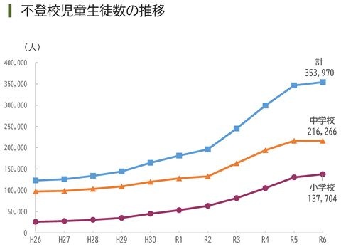 同調査によると、小・中学校における不登校児童生徒数は、合計で353,970人(前年度346,482人)で過去最多となり、12年連続で増加している。