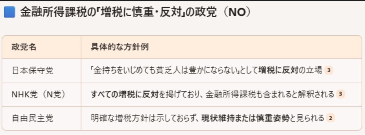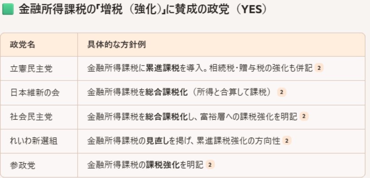 、その方向性を否定しない限り金額所得税があがる可能性が高い他の党は累進制や総合課税や増税など金融所得課税を上げると明確な方針