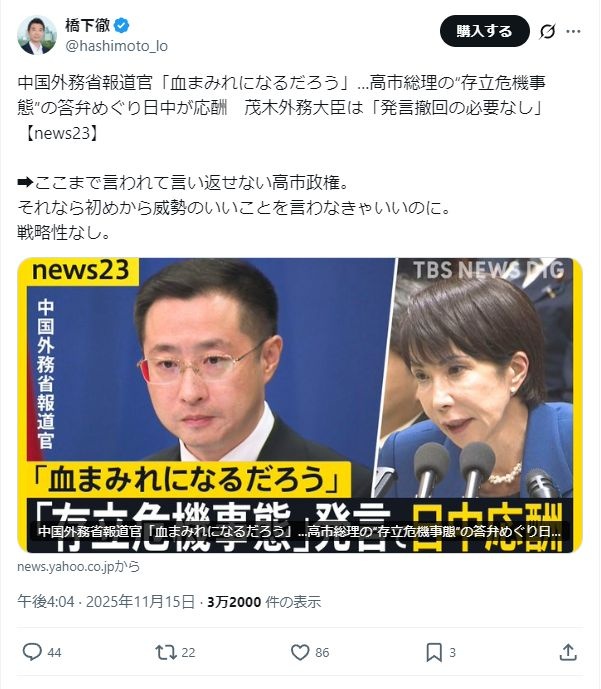 橋下徹「一部威勢のいい支持者を極端に意識する高市政権の超弱点と危うさ。力がないときにはキャンキャン吠えるべきでない。」