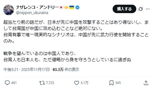 ウクライナ出身の政治評論家ナザレンコ・アンドリー氏が18日までにX(旧ツイッター)を更新。高市早苗首相の台湾有事をめぐる発言について私見を述べた。
