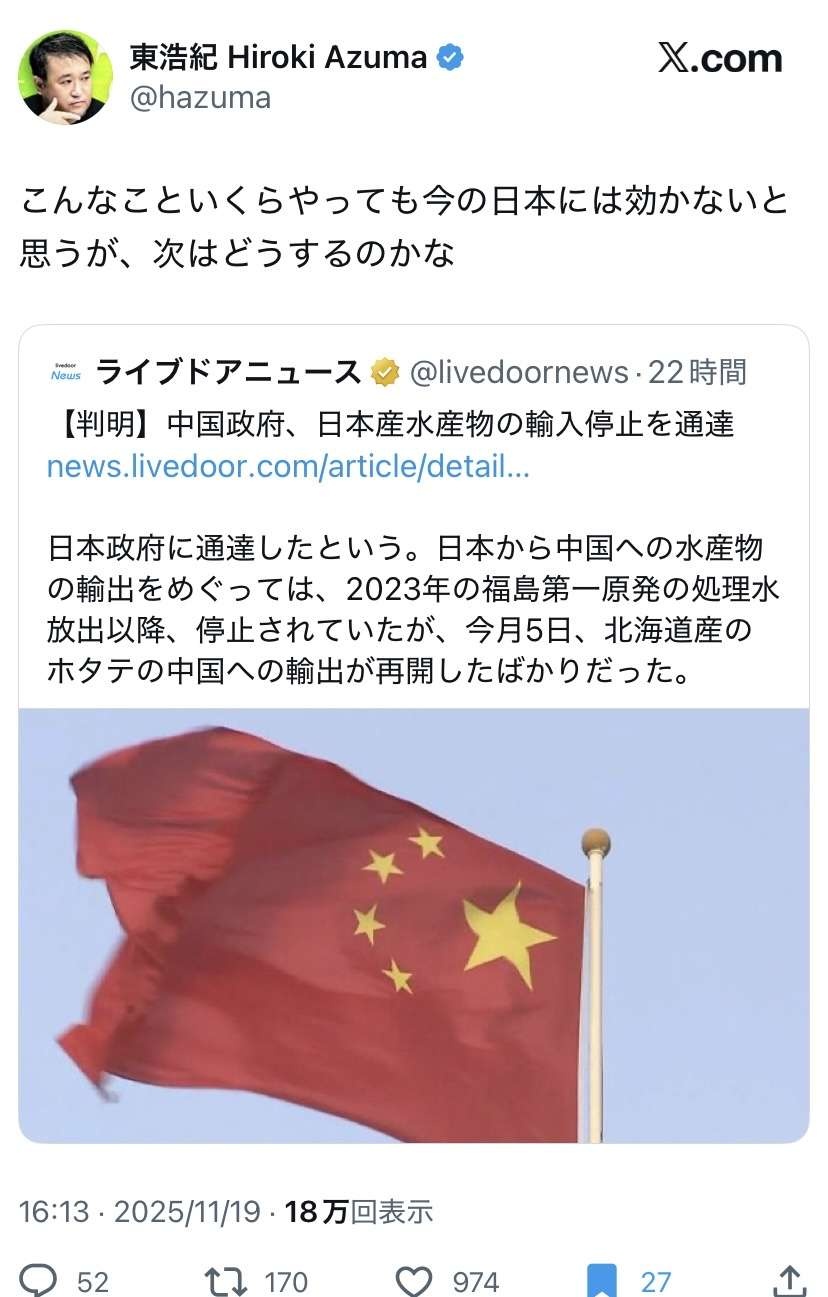 その人達が中国に買ってもらえなくなったせいで生活苦しいですって言ってきたら「日本には効いてないんだから黙ってろ」って突っぱねるのかね
