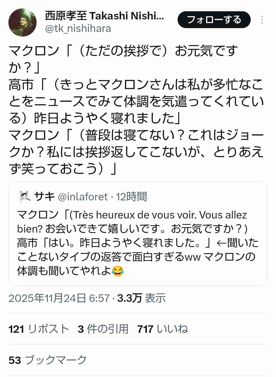 忙しいマクロンが高市の調子とか知るわけないのに、被害妄想酷ない?