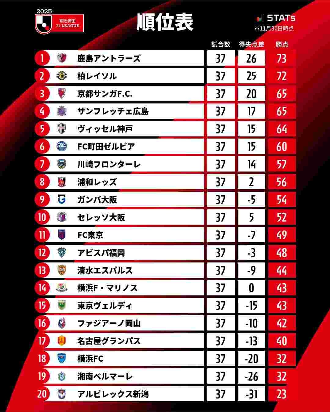 連覇中の王者ヴィッセル神戸らが脱落し、優勝争いは首位鹿島と勝ち点差「1」の2位柏レイソルによる一騎打ちに。30日に2025明治安田J1リーグ第37節が行われ、鹿島は敵地で東京ヴェルディと、柏は敵地でアルビレックス新潟と対戦した。