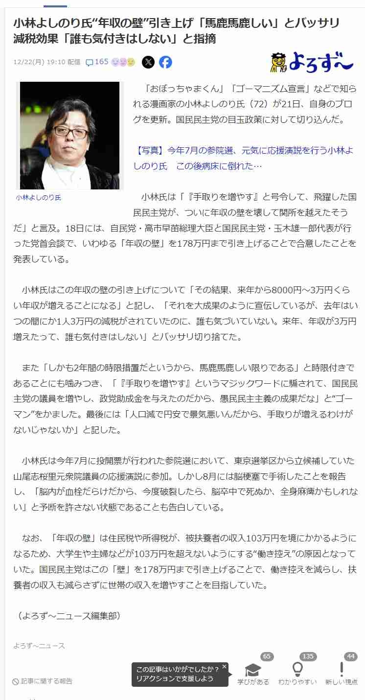 小林よしのり「年収の壁引き上げ、年収が3万円増えたって誰も気付きはしない、手取りを増やすに騙された愚民民主主義の成果