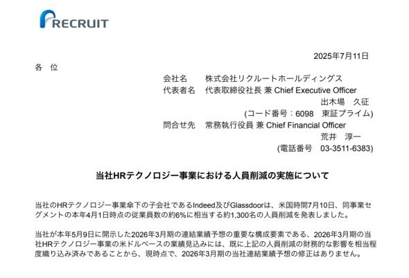 リクルートホールディングスは7月11日、HR(人材)テクノロジー事業傘下の米Indeedと米Glassdoorで、約1300人の人員を削減を実施すると発表した。HRセグメントの従業員数の約6%に相当する人数だ。