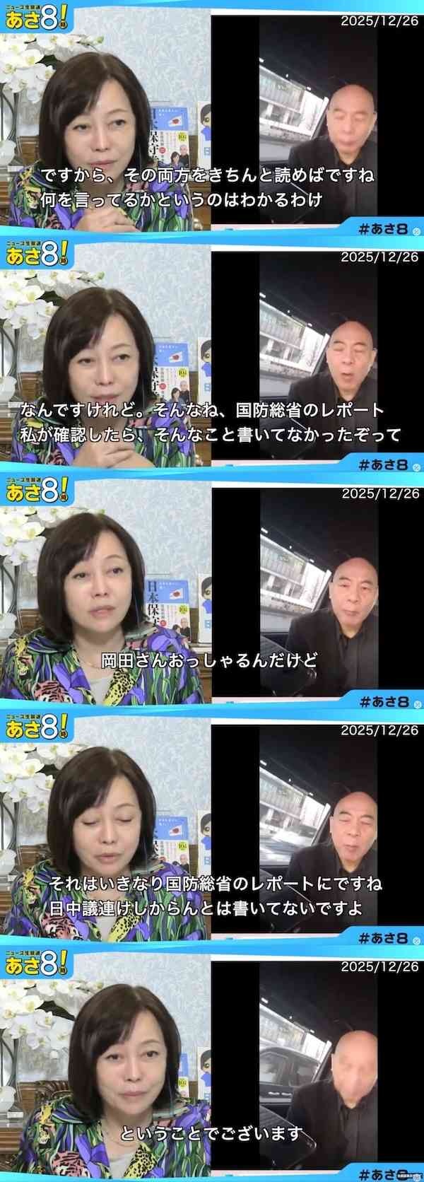 その上で「国防総省のレポートを見たら、日中議連はスパイと書いてあるかと。そんな単純なものじゃない。文書を複数読めば、何をアメリカ側が警告しようとしているか、ということは明らか」「直接には書いてないかもしれないけど、ズバッとはね。でも、このジェームスタウン財団のレポート、同じ時の国防総省のレポートを読めば、これはこの部分だなということはわかる」などと主張した。