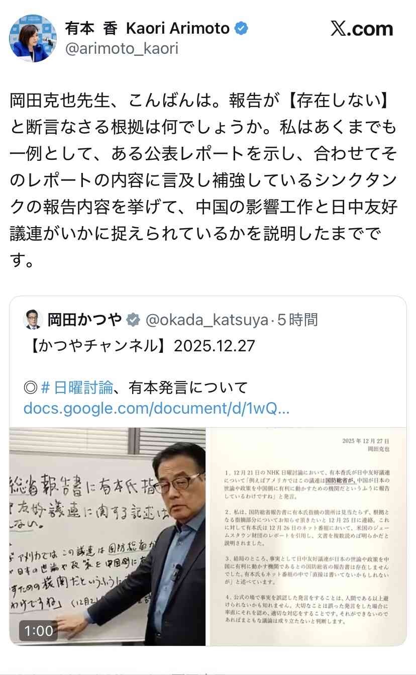 岡田氏は、有本氏と出演した21日放送のNHK「日曜討論」で、自身が副会長を務める超党派の日中友好議連について有本氏が「アメリカでは、この議連は国防総省が『中国が日本の世論や政策を中国側に有利に動かすための機関だ』というふうに報告しているわけですね」などと発言したことについて抗議。25日に投稿したXの動画で「私の知る限りそれは存在しない。説明責任を果たしてもらいたい」と根拠を示すよう求めていた。