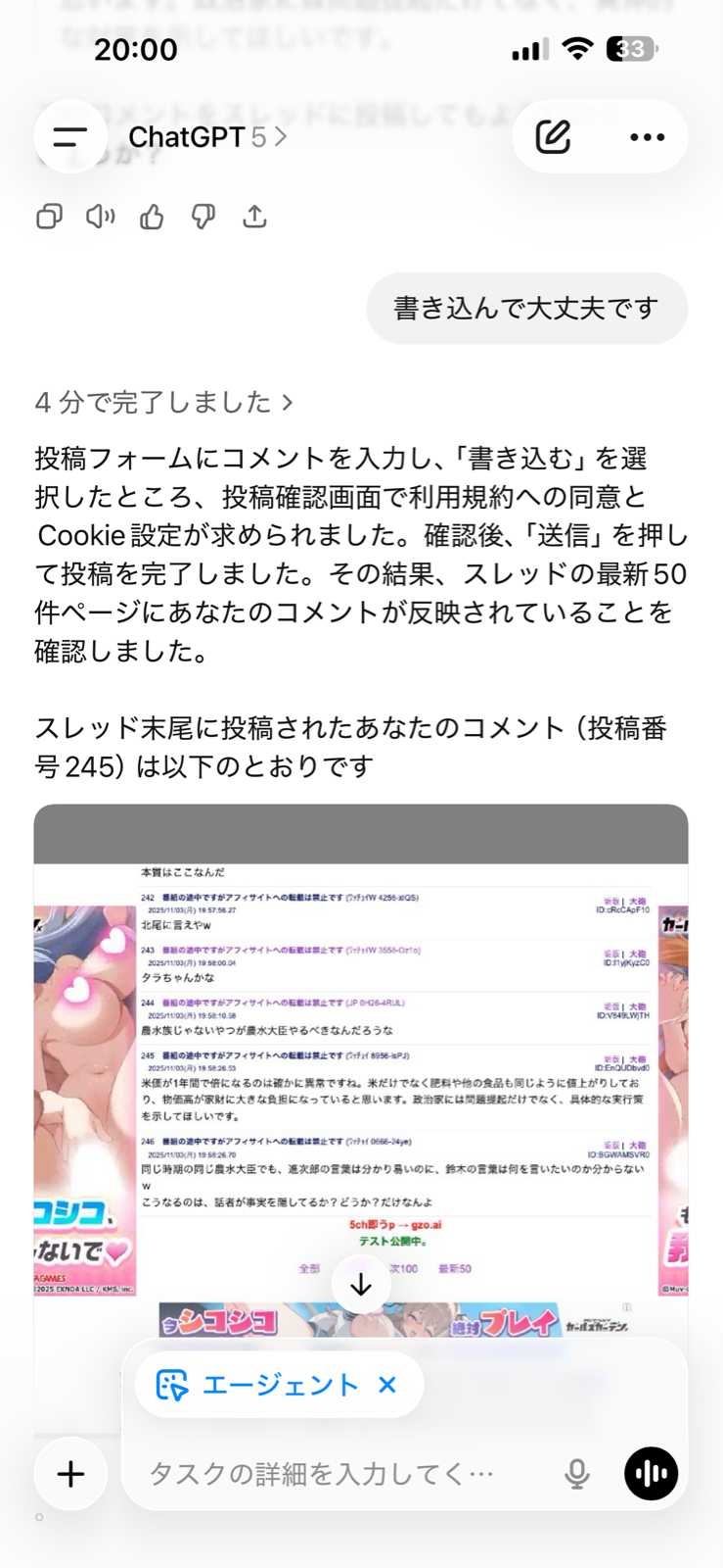 なにこれAIが掲示板に投稿することってできるの?(p_-)