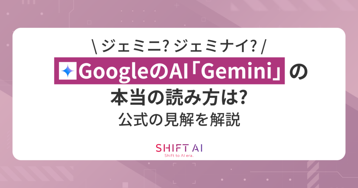 【ジェミニ?ジェミナイ?】GoogleのAI「Gemini」の本当の読み方は?公式の見解を解説|SHIFT AI TIMES「Gemini」の正しい読み方が気になる方に向けて、日本語での読み方を紹介しています。公式の見解も載せているので、正しい読み方を理解できるようになるでしょう。英語だとどのように聞こえるのか検証動画も載せているので参考にしてください。shift-ai.co.jp