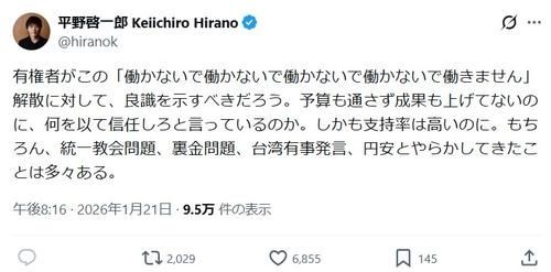 平野氏は「有権者がこの『働かないで働かないで働かないで働かないで働きません』解散に対して、良識を示すべきだろう」と書き出した。そして「予算も通さず成果も上げてないのに、何を以て信任しろと言っているのか。しかも支持率は高いのに。もちろん、統一教会問題、裏金問題、台湾有事発言、円安とやらかしてきたことは多々ある」とこのタイミングでの“高市解散”に対し、疑問を呈した。
