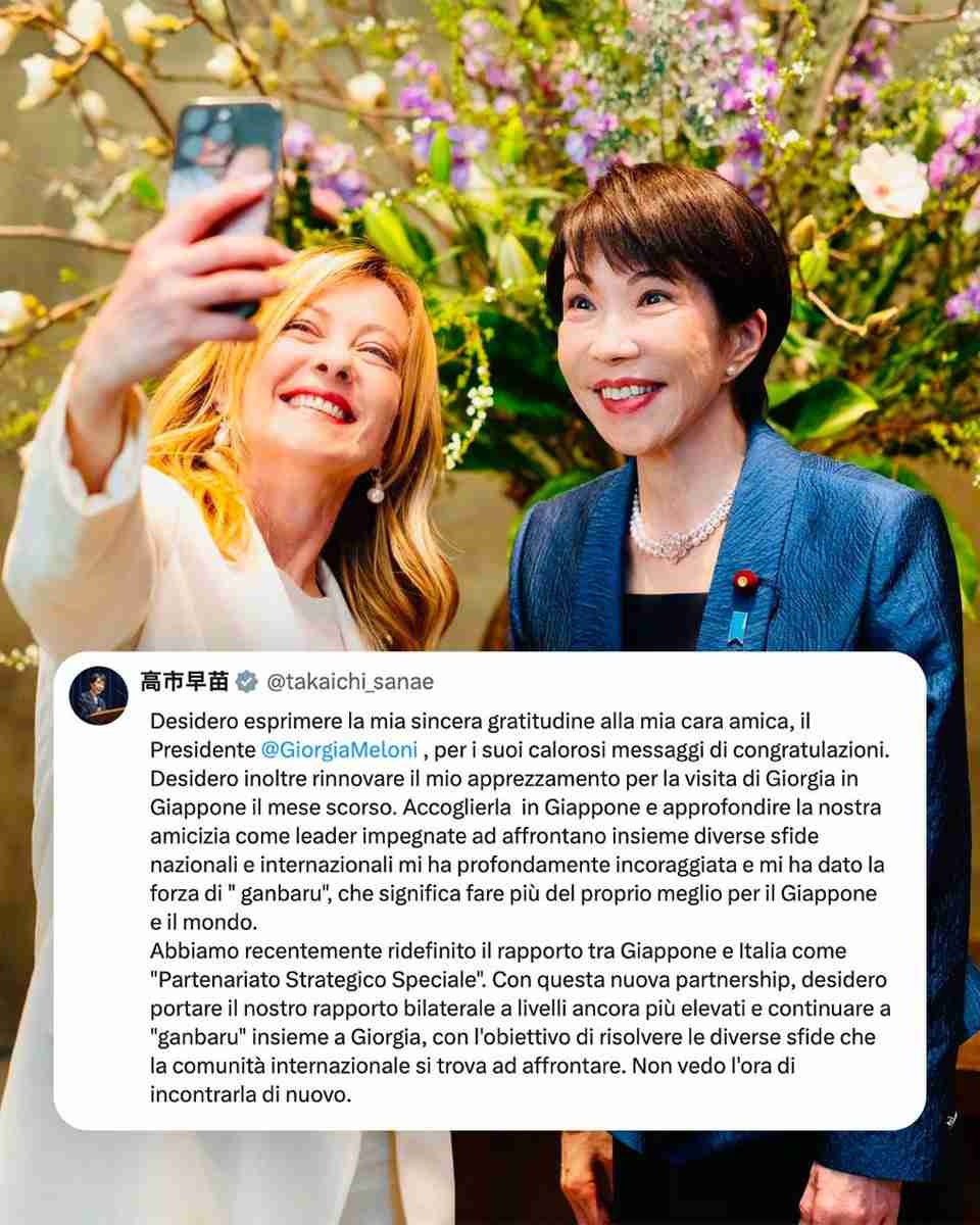 メローニ氏は同日夜、選挙速報を受け、自身のXで高市氏に宛てた祝福のメッセージを投稿した。