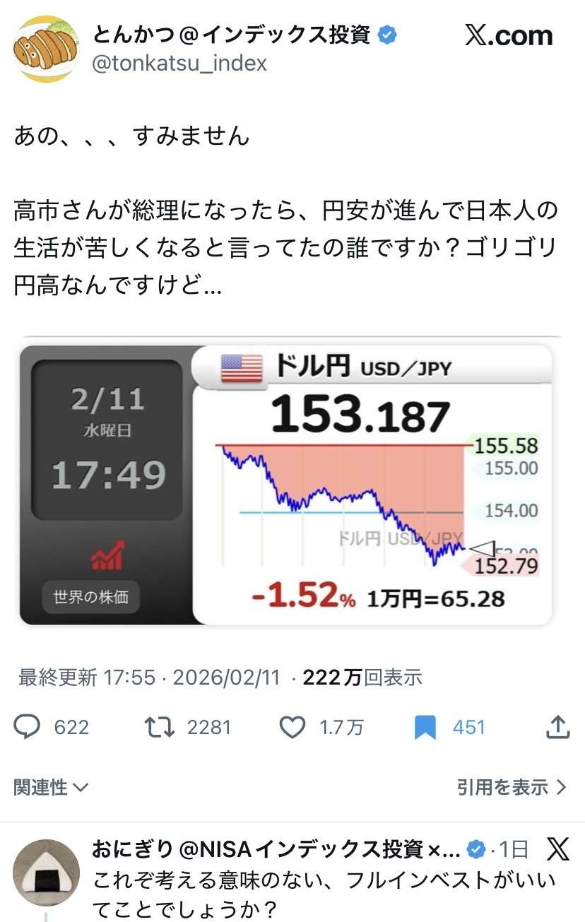 高市就任からの実効為替レートの推移ってどんな感じなんやろ