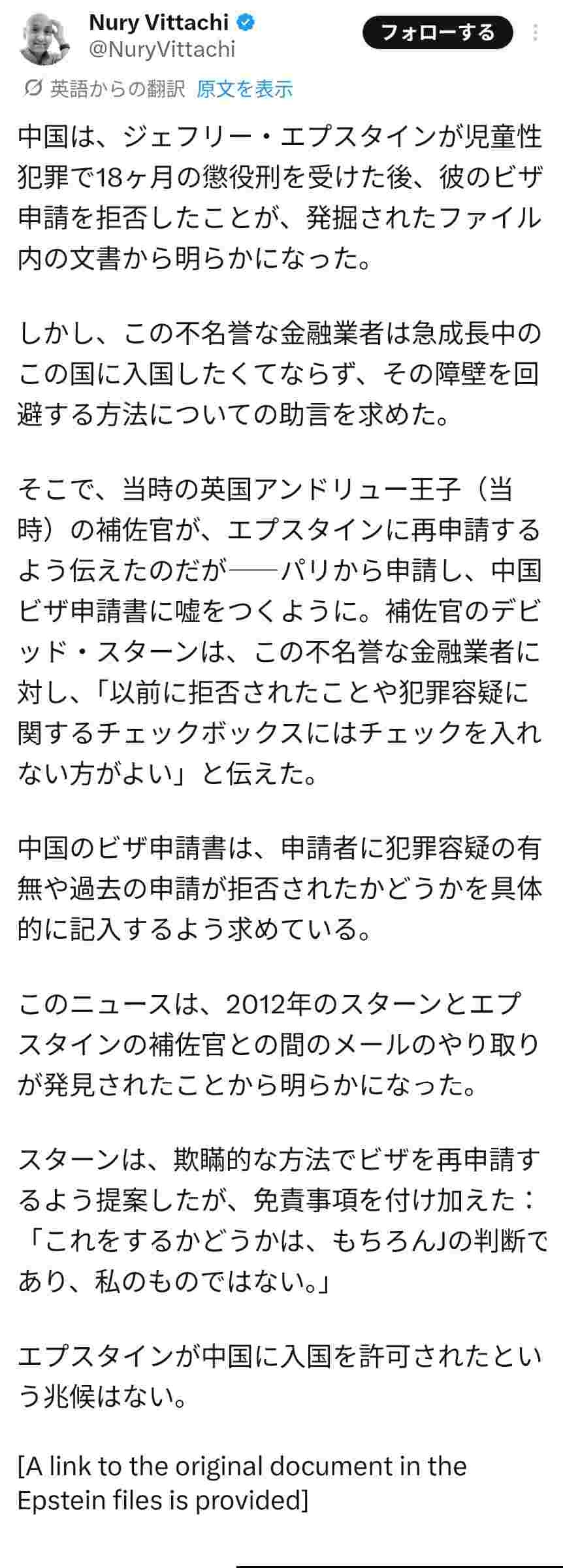 エプスタイン氏、中国への入国ビザ申請を拒否されて周りに相談していた事が判明してしまう。やっぱり父さんだけが正義だよ
