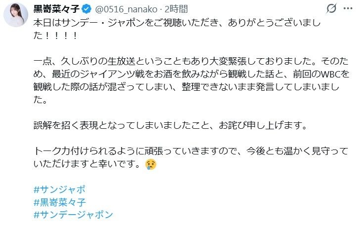 https://www.nikkansports.com/entertainment/news/202603010000468.htmlタレント、グラビアアイドルの黒嵜菜々子(22)が1日、自身のXを更新。同日に生出演したTBS系「サンデー・ジャポン」の発言が「誤解を招く表現」だったとして謝罪した。