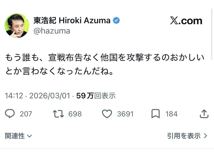 東浩紀「もう誰も、宣戦布告なく他国を攻撃するのおかしいとか言わなくなったんだね。」