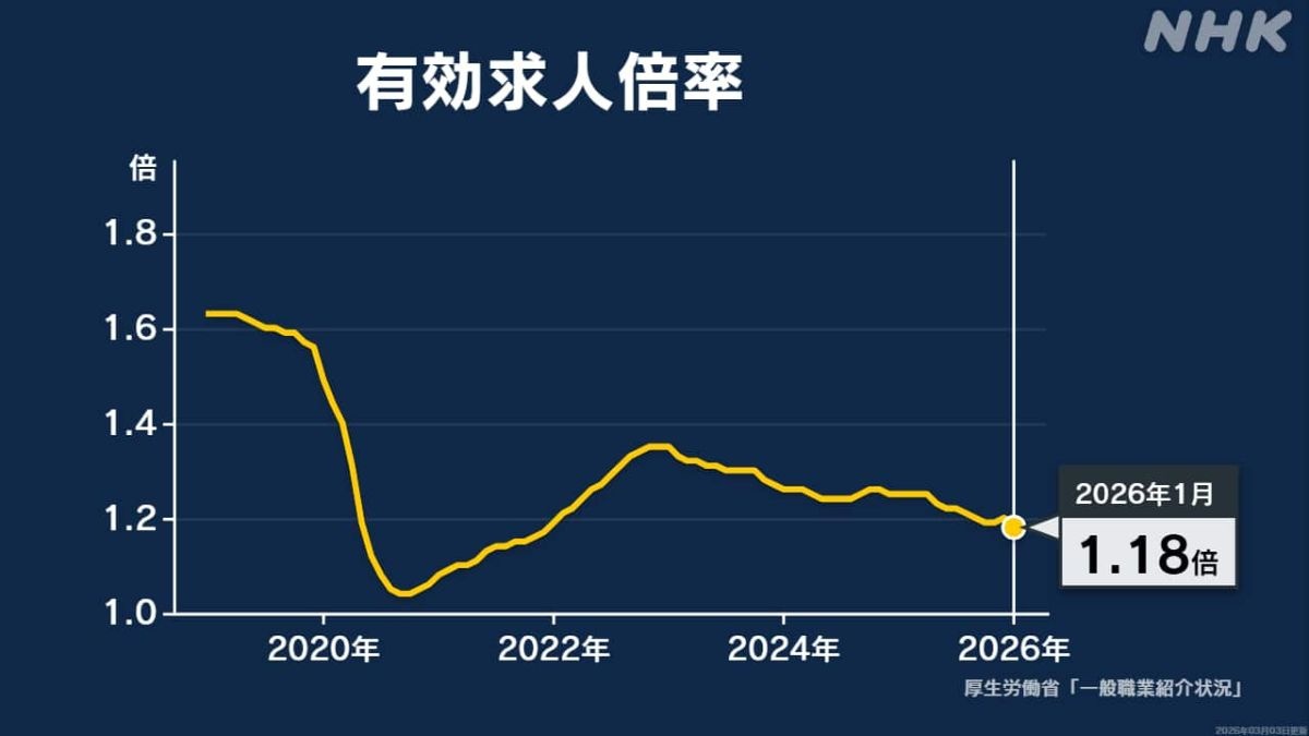 厚生労働省によりますと、仕事を求めている人、1人に対して何人の求人があるかを示す有効求人倍率は、ことし1月の全国平均で1.18倍と、前の月を0.02ポイント下回りました。