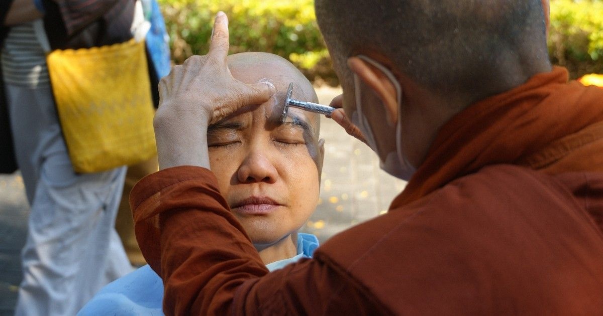 朝の日差しに照らされた頰を、涙が滑った。歌うようなパーリ語の読経が響く中、白髪交じりの短髪にハサミが入る。パトゥーム・ウィチャイカムさん(51)は、こみ上げる思いを抑えるかのようにきつく唇を結んだ。「女性は出家できない」と言われてきた国で、幼い頃からの願いがようやくかなう。