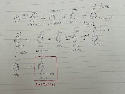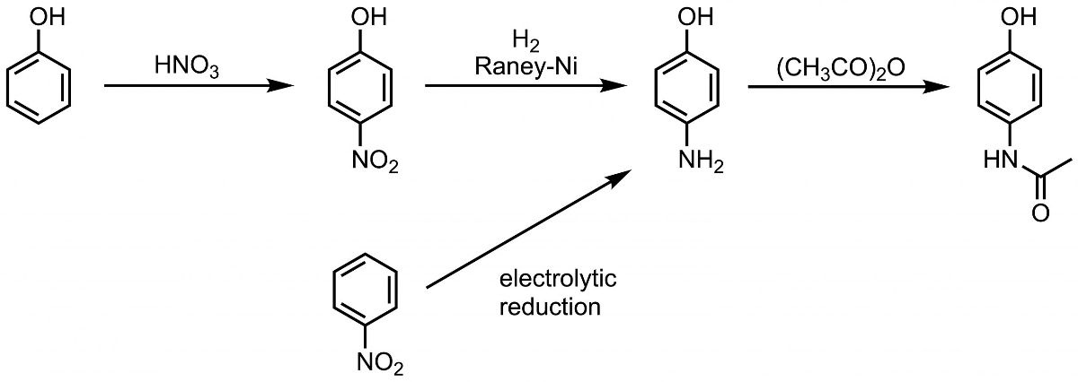 フェノールが p-アミノフェノールに変換され、錠剤にアセチル化される。