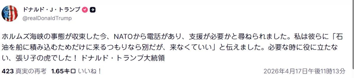 ホルムズ海峡の事態が収束した今、NATOから「支援が必要か」と電話があった。俺は「石油を船に積み込むだけなら別だが、それ以外なら近寄るな」と伝えた。必要な時に役立たずだった、まさに紙の虎だ! トランプ大統領