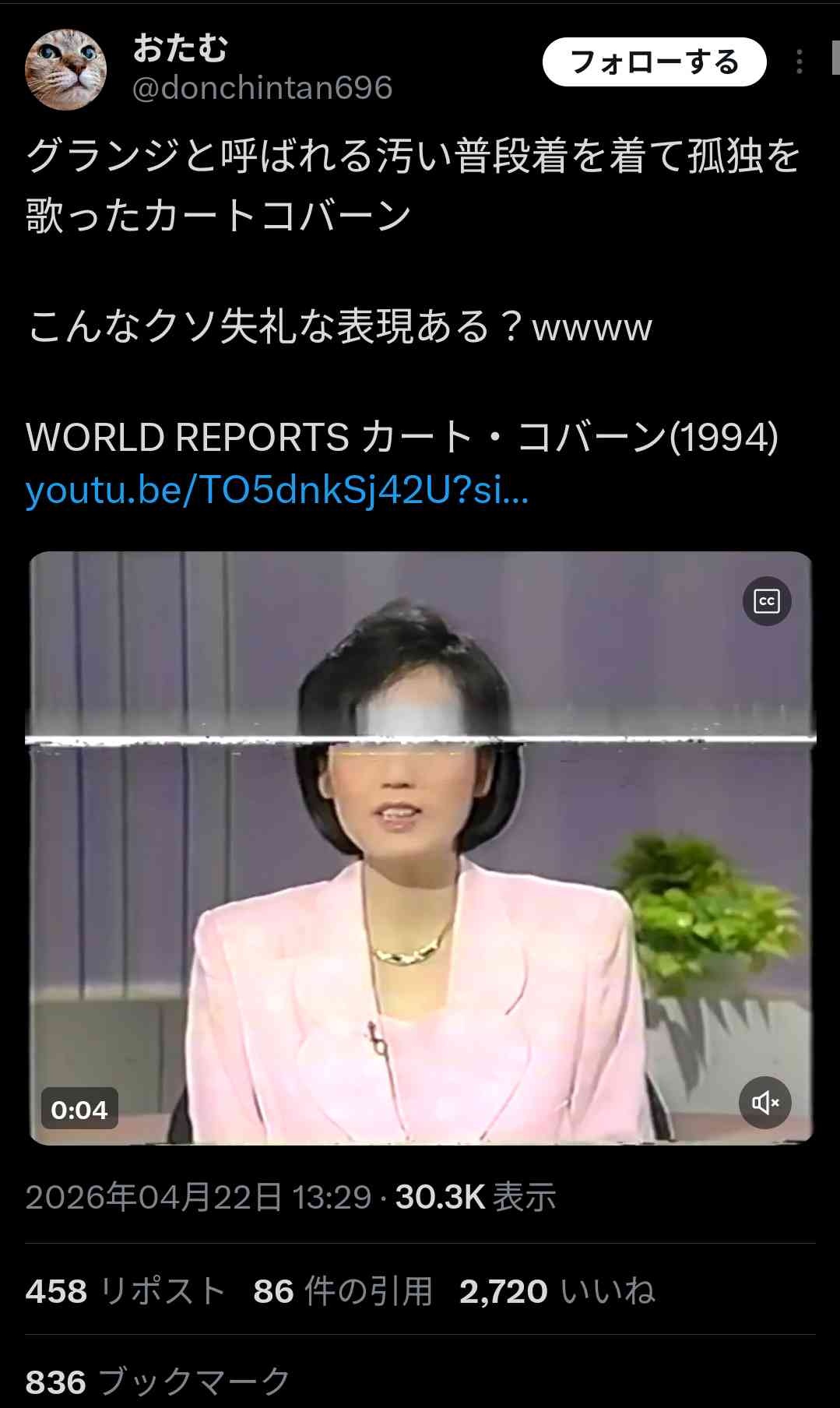 NHKアナ「グランジと呼ばれる汚い普段着を着て孤独を歌ったカート・コバーンが亡くなりました」