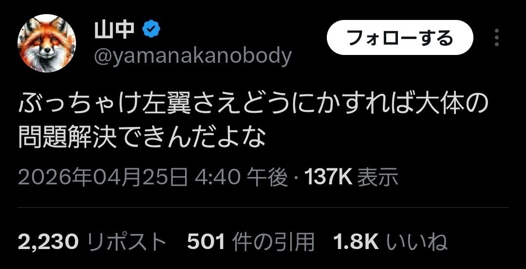 高市快勝で左翼などいなかったって設定はどこ行ったんだよww