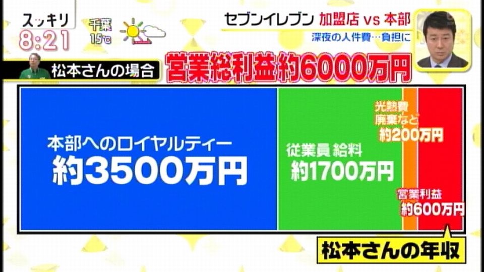 コンビニの利益6500万円-セブンイレブンのブランド料金3500万円-人件費1700万円-光熱費200万円=オーナーの手取り600万円