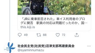 車椅子問題に異論を唱えた社民党沼津支部Twitter、アカウント凍結