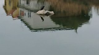 【嫌儲お絵かき部】川に謎の鳥。カワウでしょうか。カワセミの鳴き声がしますが姿は見えません。カワセミは都市部でもみかけます。