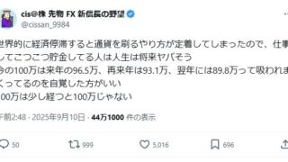 投資家cisさん「こつこつ貯金だけのケンモメン将来ヤバそう、今の100万は来年の96.5万、吸われまくってるのを自覚した方がいい